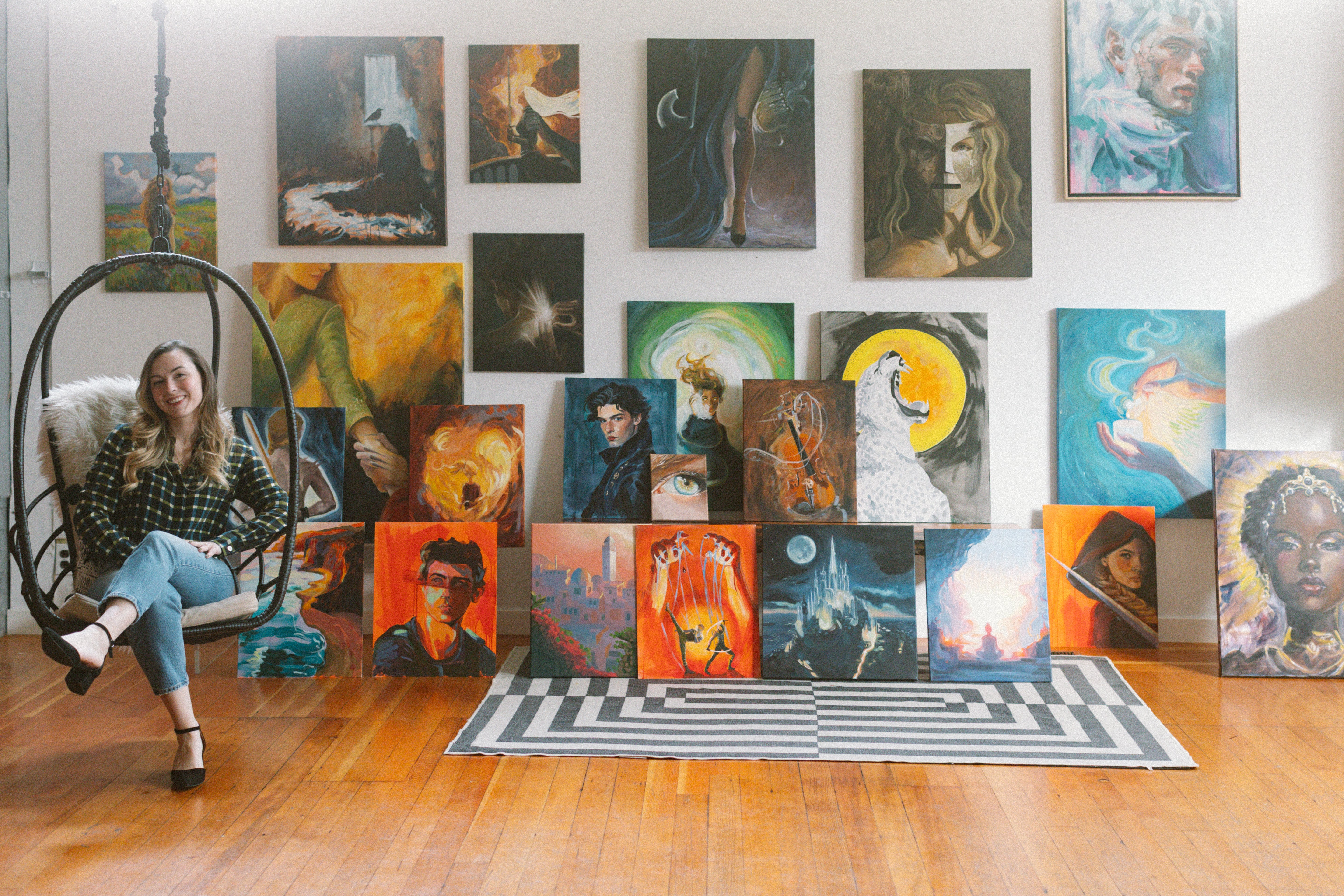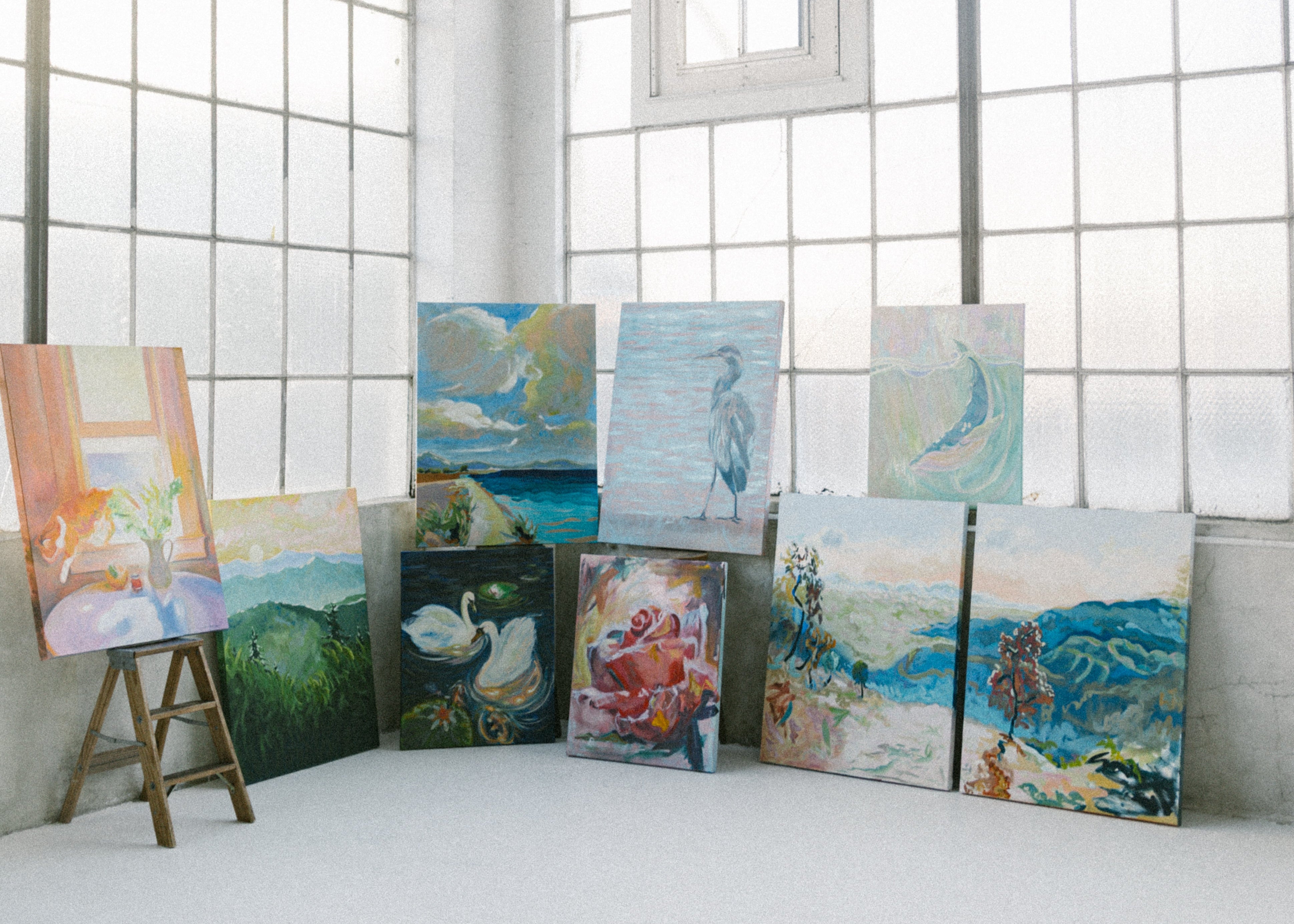 All works are crafted on paper or canvas using traditional mediums.